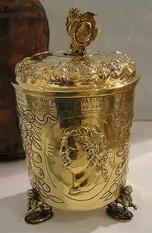 Emmerich Grach (1753–1826), the first of the actual owner-family, greeted in his function as alderman Napoleon I on 6 October 1804, when Napoleon visited Trier. He offered him wine from his vineyard St. Maximin at Oberemmel in a gold-plated silver-goblet from the 17th century. The goblet later was engraved “Gravure commandée à la memoire de ce mémorable evenement par Emmeric Grach, possesseur de cette coupe”.[3] It was auctioned at Sotheby's in New York City in 2001 for $23,750USD[4] and is on permanent loan to the museum of Trier since 2004, replacing a reproduction.[5]