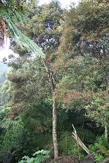 Weinmannia silvicola, known as towai or tawhero, is a medium-sized evergreen tree of the family Cunoniaceae native to northern New Zealand. It grows to 15 m or more, with a trunk up to 1 m in diameter. Adult leaves are toothed and leathery, with up to five pairs of leaflets. Juvenile leaves are thinner and have up to ten pairs of leaflets. Flowers are small and pink or white, occurring in 8–12 cm racemes. Fruits are 4–5 cm capsules,[1] which release many tiny seeds that are dispersed by wind.[2] Towai occurs in forest and forest margins from North Cape south to the Waitakere Ranges west of Auckland.[3] A closely related tree, kamahi (W. racemosa), replaces towai south of latitude 37°S.[4]