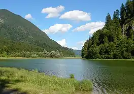Weitsee is a small lake on between Reit im Winkl and Ruhpolding with an area of 63.60 ha and a maximum depth of 9.30 m. The lake itself is separated into a shallow western and a deeper eastern part by a mountain peninsula. It is the first lake in the Dreiseengebiet (Three Lake Area) followed by the Mittersee and Lödensee. The lakes are located in the valley between the Gurnwandkopf und Dürrnbachhorn next to the Deutsche Alpenstraße B305 (German Alpine Street).
