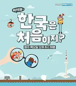 Welcome, First Time in Korea? (Korean: 어서와~ 한국은 처음이지?) is a South Korean television show that airs on MBC every1. The show is in a reality television-travel show format and first aired on June 1, 2017.[1][2][3] Each trip features a foreigner living in South Korea who invites three friends from their home country to travel to South Korea for the first time. The trips typically follow the format of the three friends traveling on their own for the first two days, followed by a two-day special tour organized by the hosting foreigner. Episodes also include concurrent commentary from a panel of hosts, together with the guest whose friends are featured.
