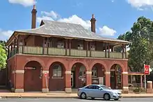 The post office is a two-storey face red brick building that has undergone several changes from its original construction in 1868 as a single-storey telegraph office and residence. The original building was constructed in the Victorian Georgian style. A two-storey northern addition was completed in 1904. It is built in the Federation Arts and Crafts style, and has a complex hipped corrugated iron roof, with a gabled hip roof to the northern two-storey section and skillion additions. The two-storey roof is punctuated on the east and west sides by two single face brick chimneys with corbelled tops and terracotta chimney pots. There are five corbelled face brick chimneys to the single-storey southern section of building and a rendered corbelled chimney to the kitchen block. Construction of the main building is a combination of stretcher bond and English bond red brickwork, with tuck pointing to sections of the front facade that is showing signs of deterioration.[1]