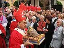Wenceslaus's feast day is celebrated on September 28.[16][17] On this day, celebrations and a pilgrimage are held in the city of Stará Boleslav, whereas the translation of his relics, which took place in 938, is commemorated on March 4.[18] Since 2000, the September 28 feast day has been a public holiday in the Czech Republic, celebrated as Czech Statehood Day.