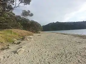 The native bush of the park is the Pohutukawa, with the blaze of red in the summer, on the slopes facing north is the Kowhai bush which are covered with yellow blooms in the spring, and the low-laying sandspit.[3][8]
