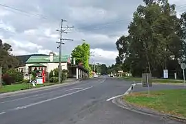 ![]() The Warburton Highway passing through Wesburn on its way to Melbourne. The Sam Knott Hotel can be seen to the left. | |||||||||||||||