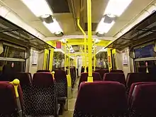 Suburban trains were also improved with the Class 313s gaining new seats with higher backs, wheelchair provision and minor improvements to fittings such as stanchions in the passenger areas. These emerged from refurbishment at Railcare, Wolverton in a plain white undercoat[13] before a metallic purple livery was introduced in 2001.[14]