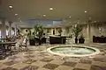 Some early advertisements claimed the hotel had more than 700 rooms, but most sources report the total was around 500. The main building contained six floors. The ground floor held the lobby, hotel management offices, the dining area, shops and meeting rooms; saunas and mineral baths were located on the top floor; guest rooms, built in two concentric circles around the atrium, were located on the second through fifth floors. Rooms on the inner ring offered a view of the atrium, while forty rooms on floors four and six had balconies overlooking the atrium.[5][29][30] The hotel rooms were small by modern standards. Most had one or two twin beds and lacked a private bathroom.[30]