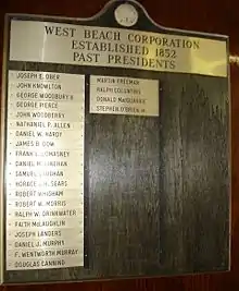 West Beach's governing organization has been incorporated since April 21, 1852 [1] by the Massachusetts State House of Representatives. The beach and surrounding land was originally deeded to John West in 1666.[1] Mr. West bequeathed the land to the residents of Beverly Farms and Prides Crossing. Section 3 of the West Beach Corporation by-laws describes the intended use of the beach for: "The members of said corporation may use and occupy said described portions of sea shore, beach and flats for the purpose of gathering drift-stuff and sea weed, and of boating and bathing, as the said premises have heretofore been used and occupied by them and predecessors; and also providing facilities for the enjoyment and beautification of the beach and shore by members; by providing swimming classes for members and their guests; to give courses in safety in the water and small boat handling...."[1] West Beach has a historic past. It is the site for the annual Farms-Prides Fourth of July fireworks display that has occurred for over 100 years. Noted Author, John Updike, who resided locally was a frequent visitor. Nineteenth-century author Nathaniel Hawthorne from the nearby city of Salem, Massachusetts visited West Beach as noted by his son.[2] Artist Fitz Henry Lane painted a landscape of the beach in the mid-19th century that sold for $3.85 million at an art auction in 1997. [3]