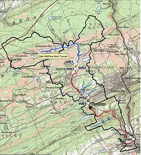 ![]() Topographic map of West Branch Schuylkill River watershed. The black line denotes the watershed boundary. | |