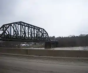 The West Brownsville Junction Bridge carries the Norfolk Southern Railway across the Monongahela River from Brownsville Township to West Brownsville in the state of Pennsylvania. The main span is a 401-foot (122 m) Pennsylvania (Petit) truss.[1] The structure was originally designed by the Pennsylvania Railroad as a low-level connector between its mainline and Waynesburg Branch. Today, the bridge continues to serve the same purpose that it has since its inception, carrying coal trains between mines and power plants or other industrial sites.
