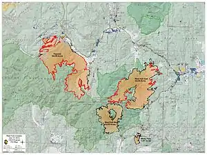 The West Fork Complex was a complex of wildfires near Wolf Creek Pass in southern Colorado.[2] The first fire, the West Fork fire, was started by lightning at about 1 PM on June 5, 2013. All three fires were started by lightning. As the fire moved into heavy dead timber in early June, thousands of firefighters struggled to prevent movement of the fires into populated areas.[1]