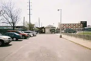 In 1893, the Long Island Rail Road established a subsidiary that ran through West Hempstead between Valley Stream and Mineola called the New York Bay Extension Railroad Company which was merged into the LIRR nine years later. A low-cinder platform station was installed between Rockaway Road (today's Hempstead Avenue) and Fulton Street (now Hempstead Turnpike), which contained a bridge over the tracks and station for the New York and Long Island Traction Company trolleys. By 1926, the line was electrified with a substation built southeast of the current station site that remains to this day.[3] West Hempstead Station was rebuilt in 1928 on the north side of Hempstead Avenue and relocated onto the south side of the road on September 15, 1935. The 1935 station house ran directly along a loop driveway in front of Hempstead Avenue with a canopy leading from the back door to a second canopy along the platform of the tracks. Freight spurs and team tracks spread out just south of the station, some of which ended along the south side of Hempstead Avenue. The line initially extended north and connected with the current Hempstead Branch, leading to Mineola Station, and also contained a link to the Oyster Bay Branch. It was then cut back in 1959 to its current terminus of West Hempstead.[4] The site of the canopy along the tracks was replaced with the current brick structure, and the yards along the northwest side of the tracks were replaced by the Courtesy Hotel, which was torn down in 2011 and replaced by a group of apartment buildings.