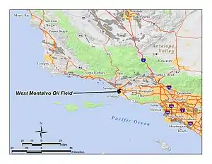 The West Montalvo Oil Field is a large and productive oil field on the coast of Ventura County, California, in the United States, in and adjacent to the city of Oxnard, California. Discovered in 1947,[1] it has produced approximately 43.7 million barrels (6,950,000 m3) of oil, and retains about 2.2 million recoverable with current technology, in both the onshore and offshore areas. The offshore portion of the field is exploited from wells directionally drilled from onshore near McGrath Lake, from within an enclosure above the high-tide line at McGrath State Beach.