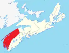 It reaches from Berwick in Kings County (it only includes the western part of Kings County) down through Annapolis County, Digby County and Yarmouth County, ending at the Yarmouth-Shelburne border.
