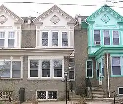 Other developments introduced urban density and architectural uniformity: the Queen Anne style with columned porches and decorative spindlework, brickwork and corbelling; steeply pitched gables with fishscale slate shingles; turrets; balconies; and windows with a single pane surrounded by small panes. These houses are typical of the early 20th-century developments in West Philadelphia, and are unified by rhythmic patterning of porch and gable features. The second story, projecting, semi-hexagonal bay is incorporated into this design, an element which defines the later rowhouses.