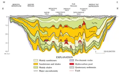 Geographically it corresponds to the West Siberian plain. From continental West Siberia, it extends into the Kara Sea as the East-Prinovozemelsky field.