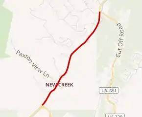 West Virginia Route 972 was a short north–south state highway in Mineral County, West Virginia. It was decommissioned in July 2017, becoming an extension of WV 93.[2] The route connected U.S. Route 220 to U.S. Route 50 in the New Creek Valley. New Creek, West Virginia, the only populated place on the route, is located midway between US 50 and US 220. Route 972 was the highest numbered road in the state of West Virginia. Prior to 1972, WV 972 was part of US 220. In 1972, US 220 was moved to its present alignment east of New Creek.