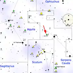 The W40 star-forming region is projected on the sky in the direction of the Serpens-Aquila Rift, a mass of dark clouds above the Galactic plane in the constellations Aquila, Serpens, and eastern Ophiuchus.[13] The high extinction from interstellar clouds means that the nebula looks unimpressive in visible light, despite being one of the nearest sites of massive star formation.