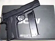 Western Arms (commonly shortened to "WA") is an airsoft gun manufacturer. They primarily manufacture 1911 and 2011 variants, though they do make several Beretta 92 types and have made other types of pistols. Recently, they have added three types of GBB M4 carbine rifles to their lineup of gas powered replicas. Currently, they only produce gas powered blowback replicas, though they have made gas-electric hybrids in the past.