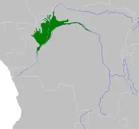 The Western Congolian swamp forests are an ecoregion of the Republic of the Congo and Democratic Republic of the Congo. Together with the adjacent Eastern Congolian swamp forests, it forms one of the largest continuous areas of freshwater swamp forest in the world. It is a flooded forest with a high canopy, dense undergrowth and has a muddy floor. It has not been disturbed very much by outside influences and so remains largely pristine as getting through this forest is called "almost impossible".[2][3][4][5][6]