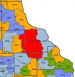 The district's territory includes all of the western half of Dubuque County, eastern parts of Delaware County, northeastern Jones County, northwestern Jackson County and extreme southeastern Clayton County. This area includes the towns of: Balltown, Bankston, Bernard, Cascade, Centralia, Dyersville, Epworth, Farley, Luxemburg, Holy Cross, New Vienna, Peosta, almost all of Rickardsville, and Worthington. All are completely or partially in Dubuque County.[6] It also serves the unincorporated areas of Fillmore,[7] Petersburg,[8] and Temple Hill.[7]