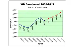 In September 2007, there were 2,776 K-12 students attending WD schools. 2,432 (87.6%) of those students lived in Dubuque County, 103 (3.7%) lived in Delaware County, 137 (4.9%) lived in Jones County, 97 (3.5%) lived in Jackson County, and 7 (.3%) lived in Clayton County. Of public school students living in Dubuque County, 18.6% attend WD schools.[9] By 2019-20, the enrollment had grown to 3,642.[1]