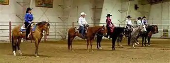 Horses and riders show in western tack and attire. The horse carries a western saddle, and wears an open-faced bridle without a noseband. The rider wears a long-sleeved shirt, sometimes with a vest or jacket, chaps, a cowboy hat, and cowboy boots. Gloves and spurs are optional. Shirts and vests or jackets are often brightly colored and sometimes elaborately decorated to mimic popular styles in western wear. Riders at smaller shows usually wear denim jeans under their chaps, while at regional and national competitions, western-styled polyester dress pants that match the rider's shirt or chaps are worn by women, while men tend to stick to jeans. Men usually wear a neckscarf, often of silk, and women may too wear a neckscarf, but in recent years as rules have been relaxed, brooches and necklaces are now also seen on female riders.
