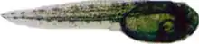 The Western pygmy perch is a small fish with a olive, brown and green mottled body with tow orange stripes along the flanks. In the breeding season the males develop brighter colouration with golden mottling along the flanks, an reddish-orange abdomen and the fins darken. The females develop a bluish colour when breeding.[3] It can reach 8 cm (3.1 in) TL.[2]