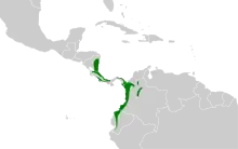 It is found in east Nicaragua, Costa Rica, Panama, west Colombia and west Ecuador. Its natural habitats are subtropical or tropical moist lowland forests and subtropical or tropical moist montane forests.