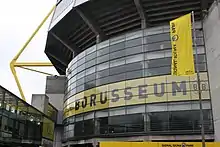 Westfalenstadion (German pronunciation: [vɛstˈfaːlnˌʃtaːdi̯ɔn], lit. 'Westphalia stadium')[5] is a football stadium in Dortmund, North Rhine-Westphalia, Germany, which is the home of Borussia Dortmund. Officially called Signal Iduna Park [zɪɡˌnaːl ʔiˈduːnaː ˌpaʁk][6] for sponsorship reasons and BVB Stadion Dortmund in UEFA competitions,[7][8] the name derives from the former Prussian province of Westphalia.
