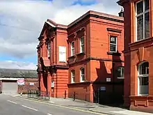 Lying within the boundaries of Lancashire since the early 12th century, Westhoughton was a chapelry and township in the ecclesiastical parish of Deane, in the Salford hundred. In 1837, Westhoughton joined with other townships (or civil parishes) to form the Bolton Poor Law Union and took joint responsibility for the administration and funding of the Poor Law in that area.[23] In 1872, a Local board of health was established for the township, but was superseded in 1894 by the creation of Westhoughton Urban District which shared local government responsibilities with Lancashire County Council. In 1898 most of Over Hulton became part of the urban district.[24] Westhoughton Town Hall was built in 1903 to a plan by Bradshaw and Gass, architects of Bolton replacing the Local Board Offices at the junction of Market Street and Wigan Road.[25]