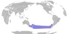 During the breeding season adults may be seen in waters around New Zealand from Cape Egmont to Fiordland in the west, through the Cook Strait, and from East Cape to Banks Peninsula in the east. They also range across areas of the Pacific Ocean and Tasman Sea around the subtropical convergence.[7] In the non-breeding season, Westland petrels migrate east to South American waters and feed in the Humboldt Current. They are often found off the coast of Chile.[9][13] Individuals usually remain solitary during this time, rejoining the colony when the next breeding cycle begins.[9]
