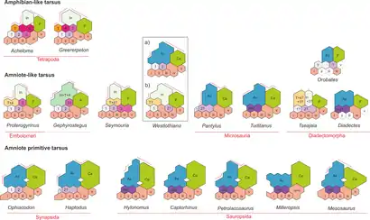The ankle of Westlothiana, as well as that of most other "reptiliomorphs", is intermediate between these two conditions. Smithson (1989) reported that "Lizzie" had nine ankle bones, including an astragalus and calcaneum, and that the third and fourth centrales were already fused or lost. Yet he also noted that centrales one and two (which formed the navicular bone) were unfused.[2] Smithson et al. (1993) later claimed that there were ten bones, arguing that the components of the astragalus were not completely fused, with the intermedium and tibiale still separate.[3] Piñeiro, Demarco, & Meneghel (2016) could not determine which of these two interpretations were superior, but did note that the largest bone more closely resembled a fused astragalus rather than an unfused intermedium.[12]