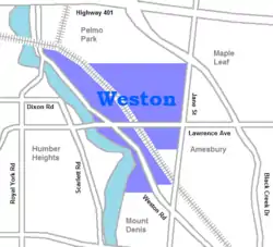 Weston is a neighbourhood and former village in Toronto, Ontario, Canada. The neighbourhood is situated in the northwest of the city, south of Highway 401, east of the Humber River, north of Eglinton Avenue, and west of Jane Street.[1] Weston Road just north of Lawrence Avenue is the commercial core of Weston, with many small businesses and services. Weston was incorporated as a village in the 19th century and was absorbed into the Borough of York in the late 1960s. York itself was amalgamated into Toronto in 1998.