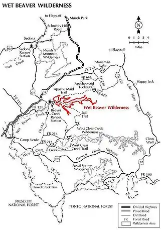 The main trailhead to reach the Wet Beaver Wilderness, the 10.8-mile (17.4 km) Bell Trail, is located approximately 2 miles (3 km) east of the Sedona exit from I-17, near the Beaver Creek Ranger Station. The Bell Trail is a historic stock trail, which follows Beaver Creek upstream for about 3 miles (5 km) before climbing steeply up to the Mogollon Rim at the southern edge of the Colorado Plateau. The only other trail in the Wilderness is the 9.5-mile (15.3 km) Apache Maid Trail.[2][3]