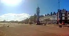 Weymouth is the largest town in the area, larger than the county town of Dorchester, which lies 11 kilometres (7 mi) to the north, and hence is a centre of activity for the nearby population.[46] Weymouth's esplanade is composed of Georgian terraces, which have been converted into apartments, shops, hotels and guest houses.[44] The buildings were constructed in the Georgian and Regency periods between 1770 and 1855, designed by architects such as James Hamilton, and were commissioned by wealthy businessmen.[4] These terraces form a long, continuous arc of buildings which face Weymouth Bay along the esplanade, which is home to statues of Victoria, George III and Sir Henry Edwards, Member of Parliament for the borough from 1867 to 1885, and two war memorials.[3][47]