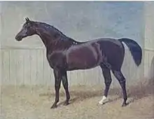 Whalebone was sold by the Duke of Grafton in October 1812 to Mr. Ladbroke for 700 guineas.[28] Whalebone's first start under Ladbroke's ownership was on 26 October at the Houghton meeting where he won a match race against Mr. Lake's two-year-old colt Turner.[29] Whalebone won an additional match race against the Lord Sackville's horse Pan at the same meeting.[30] Whalebone ran three times in 1813, winning the 100-guinea His Majesty's Plate on 8 June at Guildford against three other horses[31] and the Lewes His Majesty's Plate on 5 August.[32] On 7 August, in what was ultimately the last start of Whalebone's racing career, he won the 60-guinea Ladies' Plate against Lord Somerset's colt Offa's Dyke.[33]
