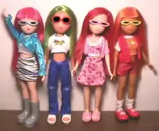 The "What's Her Look" line of 2003 seemed to have experienced a very limited release, and was the last line available in the United States. Glam, Hip, Sweet and Cool were now known as Wild, Retro, Fresh, and Chic respectively. These Dolls were about an inch taller, and much slimmer than their predecessors, though still with the large flat feet. In addition to their simple outfit and their single, glitter-streaked wig, these Dolls also came with a multi-patterned tube of stretchy fabric and a pair of scissors. The tube could be cut and customized into any number of unique clothing items for the Doll.