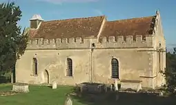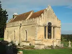 St. Andrew's contains several 17th and 18th century monuments to members of the successive manorial families, including one to John Rudge made in 1739 by the Flemish sculptor Peter Scheemakers.[3] The chancel includes 14th century stained glass showing the arms of the Whitfield family[3] and the west window of the nave has 18th century glass showing the arms of the Rudge,[3] Letten and other families.[2] The Venetian east window of the chancel has late Victorian stained glass by Morris & Co.[3] St. Andrew's has no tower; only a bell-turret. It has one bell, which was cast in 1636 by Ellis I Knight of Reading, Berkshire.[2] The church has no running water or electricity;[7] its only lighting is from candles mounted on 18th century brackets.[2] the church is a Grade I listed building.[8] In 1729, John Rudge presented a set of church plate to St. Andrew's. In Lord Charles Spencer's time the set was kept in Wheatfield Park for security, but this led to its being destroyed in the 1814 fire.[2] The present church plate is a replacement set that Lord Charles Spencer presented in 1814.[2] Past rectors include Henry Taylor, who was incumbent 1737–46.[2] St. Andrew's is now part of an extensive benefice with nine other parishes including those of Thame and Lewknor.[7]