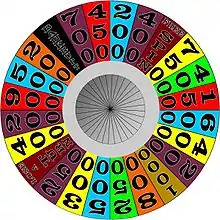 ![]() The round one wheel used in 2001. Note the 500 Gamble and Miss A Turn spaces. |