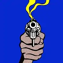 Where Is Danny? is the first album in Danny!'s discography to not feature an image of him, his likeness (à la Danny Is Dead) or even his name on the record's cover art. Instead, the album uses the artwork "Pistol" by pop artist Roy Lichtenstein. According to Swain, this was an effort to not only assert his status as an artist, but to emphasize the album's brash, "in-your-face" content.[4] The 2011 official release used an alternate "smoking gun" variant that was previously commissioned by TIME for their 1968 cover story on the prevalence of guns in America.[5]