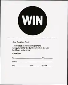 People who supported the mandatory and voluntary measures were encouraged to wear "WIN" buttons,[3] perhaps in hope of evoking in peacetime the kind of solidarity and voluntarism symbolized by the V-campaign during World War II.