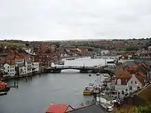 Whitby is situated on the east coast of Yorkshire facing the North Sea in a deep valley at the mouth of the River Esk. It has been a bridging point since at least medieval times and several bridges have spanned the river. The current bridge, built in 1908, is a swing bridge with a 75-foot (23 m) span that separates the upper and lower harbours which have a total area of around 80.1 acres (32.40 ha). The houses are built of brick or stone, often with red pantiled roofs, in narrow, steep streets, on both sides of the river.[48]