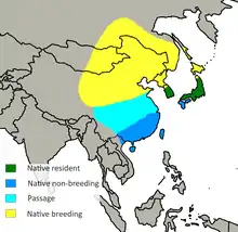 The breeding range covers central and north-east China, Korea, Japan and south-east Siberia. In winter birds from colder regions migrate south to southern and eastern China, South Korea, southern Japan, Taiwan and northern Vietnam with vagrants reaching the Philippines, Thailand and Myanmar. There is a record from Homer, Alaska in 1998 which probably arrived with a ship (West 2002).