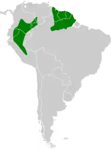 The white-chested puffbird is found in two large disjunct areas. One is from eastern Colombia and southwestern Venezuela south through eastern Ecuador and central Peru as far as the valley of the Apurímac River. The other is in the lower Amazon Basin from the Guianas east and south into Brazil's Amazonas and Pará states. It inhabits the understory of tropical evergreen forest, both terra firme and várzea. It is a bird of the lowlands. In elevation it ranges up to 200 m (660 ft) in Venezuela, 600 m (2,000 ft) in Colombia, 900 m (3,000 ft) in Ecuador (though locally to 1,200 m (3,900 ft)), and 1,500 m (4,900 ft) in Peru.[5]