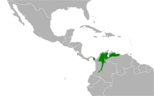 It is found in Colombia, Panama, and Venezuela. Its natural habitats are subtropical or tropical moist lowland forests and heavily degraded former forest.