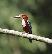 The white-throated kingfisher (Halcyon smyrnensis) also known as the white-breasted kingfisher is a tree kingfisher, widely distributed in Asia from the Sinai east through the Indian subcontinent to China and Indonesia. This kingfisher is a resident over much of its range, although some populations may make short distance movements. It can often be found well away from water where it feeds on a wide range of prey that includes small reptiles, amphibians, crabs, small rodents and even birds. During the breeding season they call loudly in the mornings from prominent perches including the tops of buildings in urban areas or on wires.