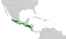 The white-throated magpie-jay is associated with a wide range of habitats from arid environments to semi-humid woodlands, from sea level up to 1,250 m (4,100 ft), although only occasionally higher than 800 m (2,600 ft). It occurs rarely in columnar cacti forest, but is common in thorn forest, gallery forest, deciduous woodland, forest edges and cultivated areas like coffee plantations. The species does not undertake any migratory movements, although males disperse away from their natal territories a few years after fledging. It is a common species across its range, and is not considered threatened by human activities.[6]