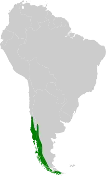 This species lives in central and southern Chile and western Argentina, from Santiago and Mendoza to Tierra del Fuego.[11] It is found in the south of its distribution in the southernmost forest in the world, on Horn Island.[17] It lives from sea level to 1,200 m of altitude,[1][11] populating forests with large trees, whether dense or not, but avoiding young forests.[22] The white-throated treerunner seeks out forests dominated by "false beech" species of the genus Nothofagus.[11] It exploits the trunks at mid-height of trees up to the top of the canopy as a small woodpecker would.[17] The species is sedentary, but can be erratic outside the breeding season.[11]