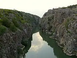The White Drin Canyon or White Drin Gorge (Albanian: Gryka e Drinit të Bardhë; Serbian: Kanjon Belog Drima, Кањон Белог Дрима) is a small canyon located in the southwestern Kosovo. The White Drin river runs through the canyon. The canyon is relatively short, only being about 900 m (1 mi) long with a depth of 45 meters. At the entrance of the canyon is Fshajt Bridge, an old Ottoman bridge which attracts divers from all over the Balkans. Canyon of the White Drin river at Fshajt Bridge due to its hydrological and geomorphological values, in 1986 was taken under legal protection as a Natural Monument.[1][2]