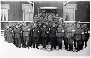 After the Civil War the function of the White Guards was unclear. In some municipalities the local White Guard was understood to be a part of the municipal administration. In others, the organisation was considered to have a primarily political role in safeguarding the result of the war.[2] The organisation was given a legal basis on August 2, 1918 by a decree of the Finnish Council of State. Changes to the decree were made later, refining the organisation's structure. From the beginning, the White Guard was considered to be a voluntary part of the Finnish military.[3]